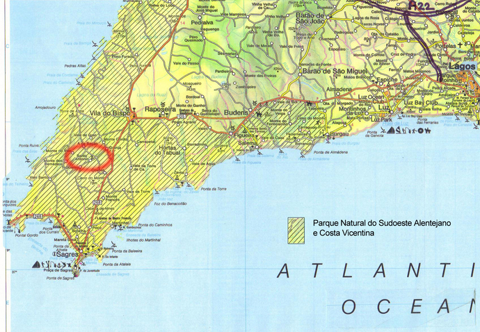 Al behoort deze streek, het "Einde der Wereld" der Klassieken (Fim do Mundo) tot de Algarve, het is er nog rustig en landelijk, en dat blijft ook zo. Het gebied behoort namelijk sinds 1988 tot een nationaal natuurreservaat (Parque Natural.....Costa Vicentina) dat indertijd een algemene bouwstop in de buitengebieden introduceerde. Op de tuin en een grote paardenwei na, zijn recentelijk de 35 hectare goed begaanbare landbouwgrond van de Monte aan de grillen van de natuur overgelaten. Het terrein wordt door twee beekjes doorsneden, die interessante flora en fauna opleveren.